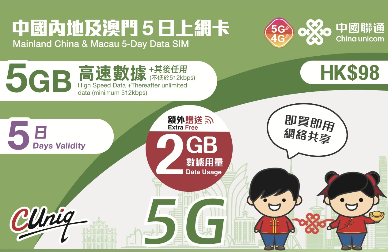 China Unicom 5GB 5G 5 Days China Macau Data Sim Card