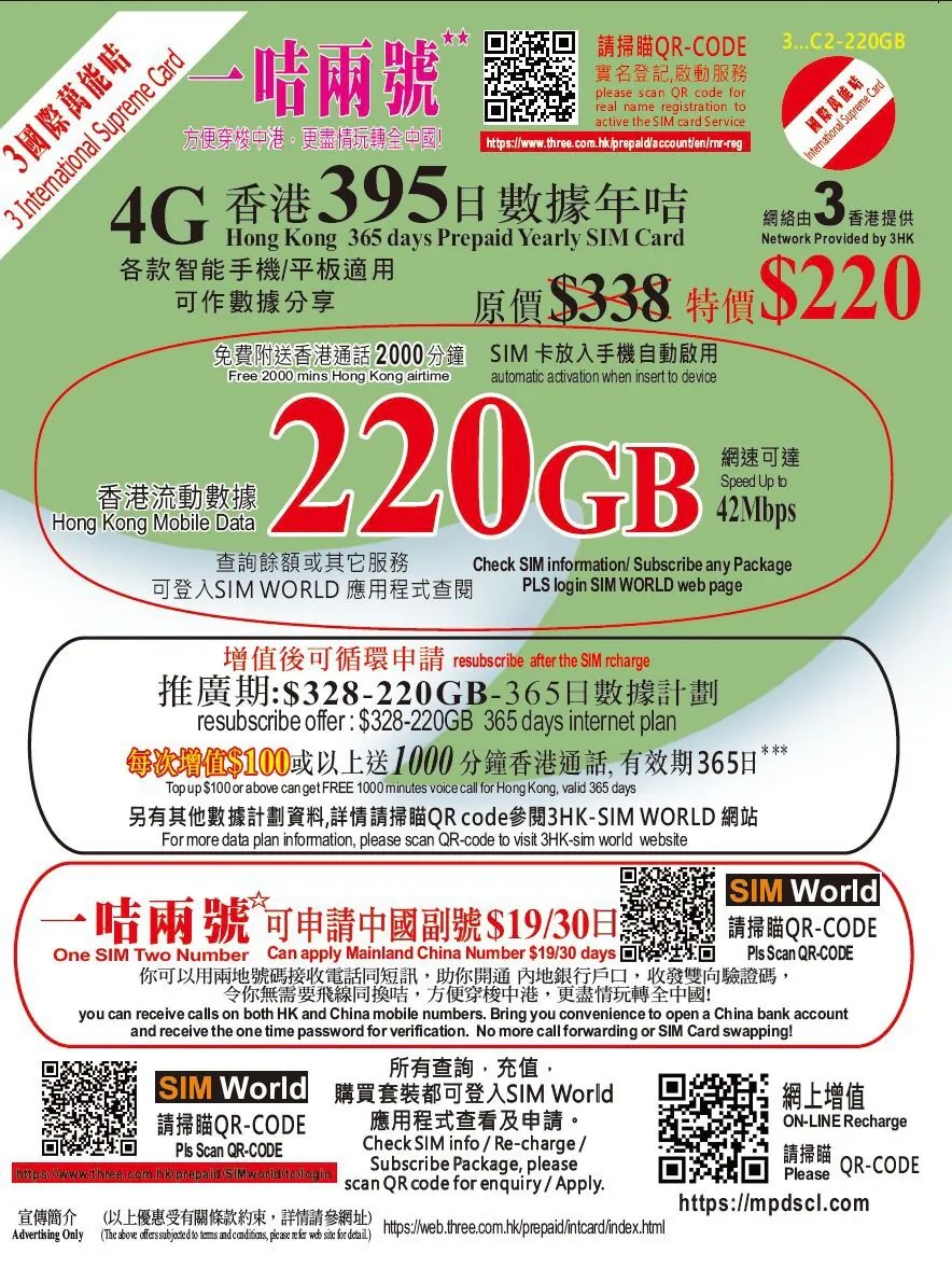 3 HK $220 220GB 395 Days Local Data SIM Card