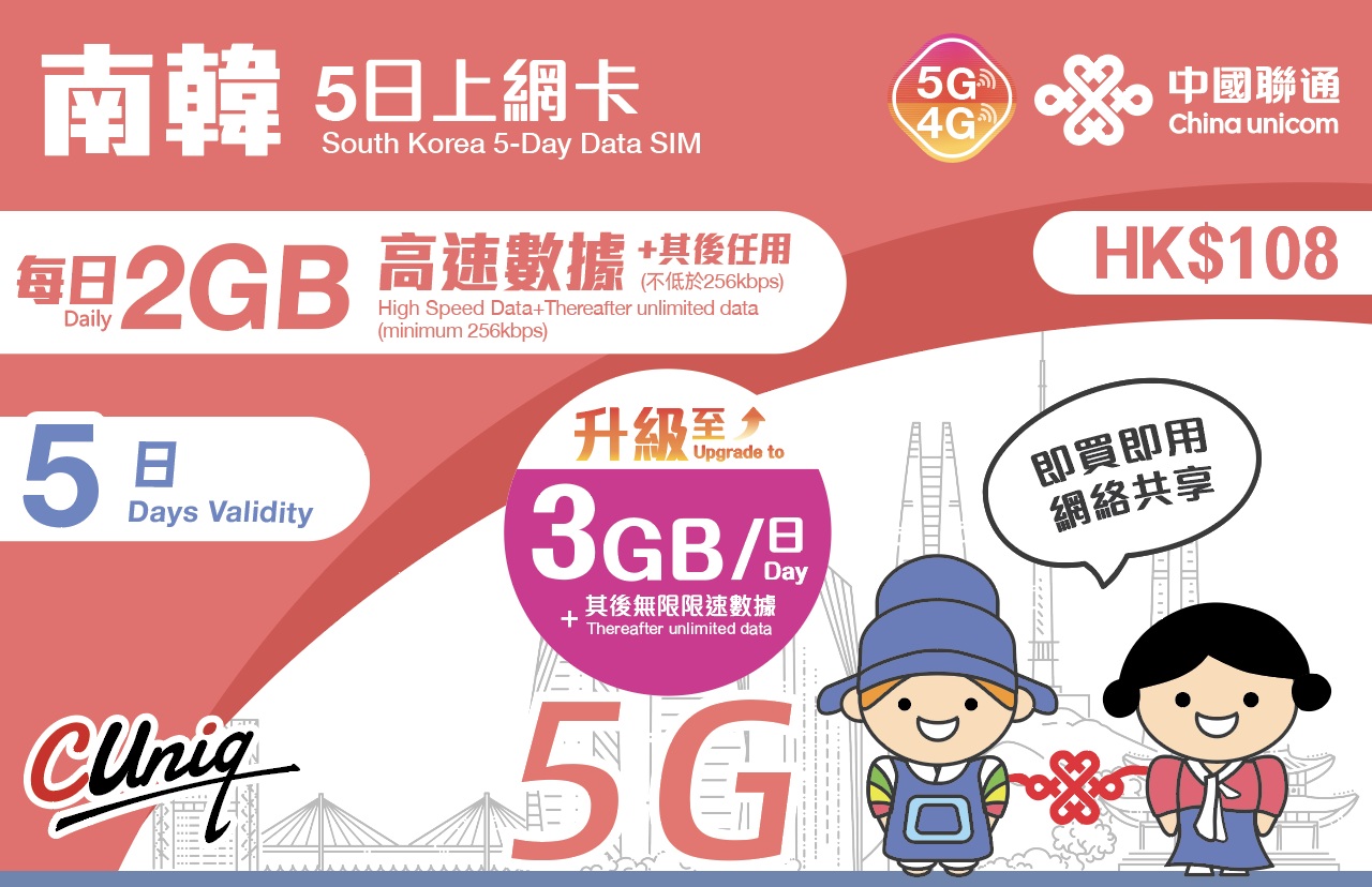 China Unicom 15GB 3GB Per Day 5G 5 Days Korea Data Sim Card