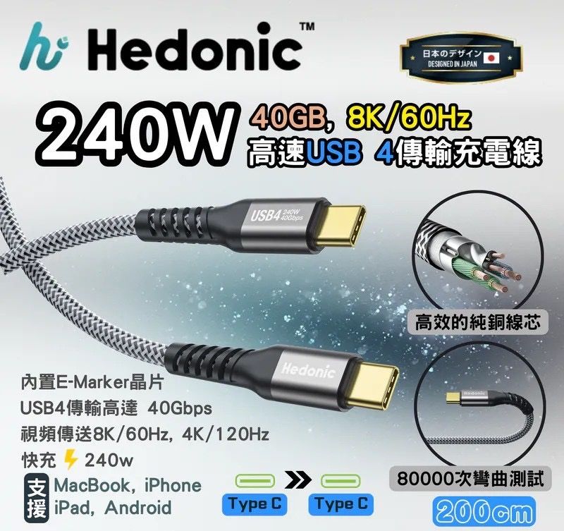 Hedonic 81067 81068 240W Type C to Type C USB 4 40 Gbps Cable